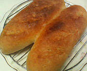 まぁ何とか成形して焼いてみましたが、やっぱり上手く出来るどころか切れ目ほとんど見えず…おまけに2本焼いたのですがぴったりひっついてしまいました。焼き色もまだらだ~。前回きれいに焼けたのはやっぱりオーブンのお陰だよなぁ~(大きいオーブンいいなぁ~いいなぁ~)。までもコレも面白いので写真に残しておきます。