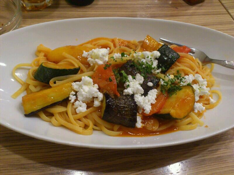 夏野菜とカッテージチーズのトマトパスタ。生パスタがモチモチ、そして素揚げしたなすが甘くて美味しかった。また行きます。