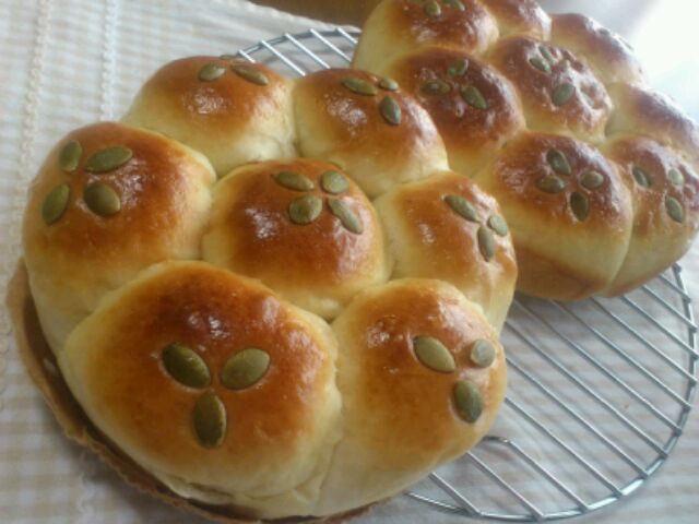 差し入れにパンプキンパンを焼きました。1回分捏ねて発酵している間に次のを捏ねて~を繰り返して2回焼きました♪