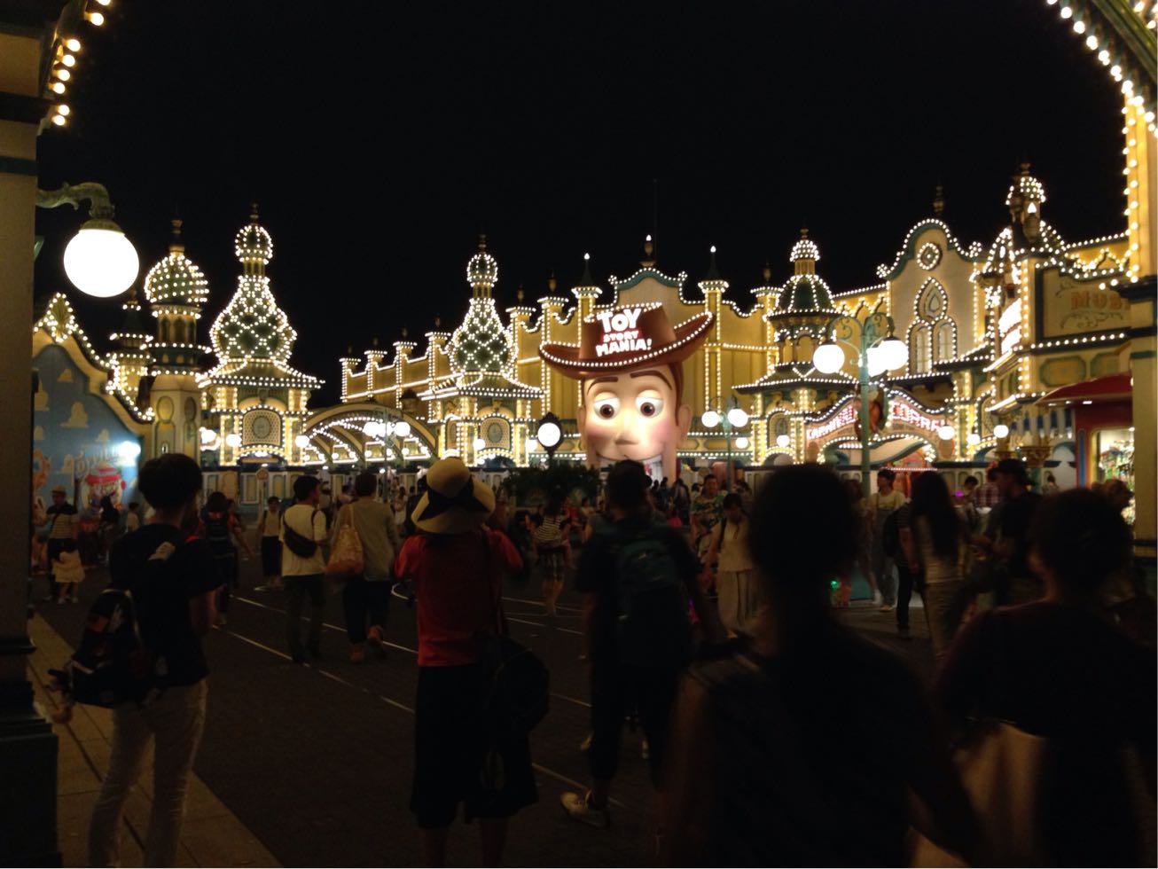 夜はトイストーリーマニアがド派手になっていました。8時過ぎなのにまだ70分待ち。人気なんですね〜、諦めました。