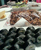 そんな訳で冬休み初日!ウチでアカペラメンバー全員揃ってのクリスマス会でした。今回のウチの料理のテーマはアメリカで学んだ食べ物。D15さんがカリフォルニアロールを巻き巻き。私はタコスの材料を用意。更にT1君が物凄い量のちらし寿司&から揚げを持ってきてくれました。実は私もすし太郎を作ろうと思っていたのですが必要なし♪楽させていただきました。隊長ご夫婦もおつまみやらお菓子やらドリンクやら更にAkiさんズバースデーケーキと色々持ってきてくれたり、N35ちゃんも野菜不足を気にしてサラダを買ってきてくれたり、食料充分。スペアリブも煮込んでいたのですが出さずじまいでした。