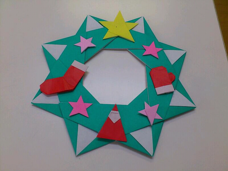 土台は緑の折り紙8枚を合体させて丸くして、小さな飾りを適当に貼り付ける。星は小さい折り紙3枚で作ります。