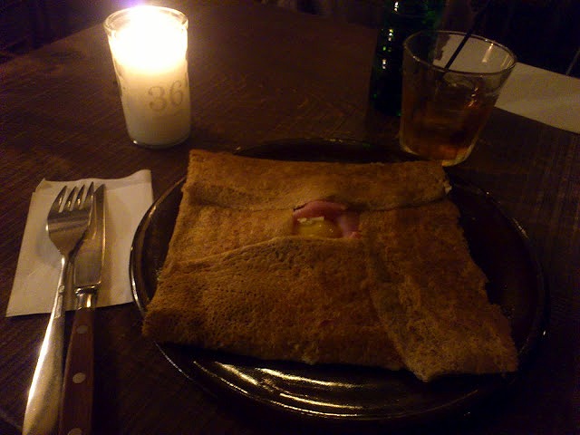 お味はですね、正直にいいますとね、ガレット食べるの初なんでね、これが美味しいガレットなのか、こんなもんなのか分からん…中はチーズ、卵、ハム。生地の端っこがカリカリでした。