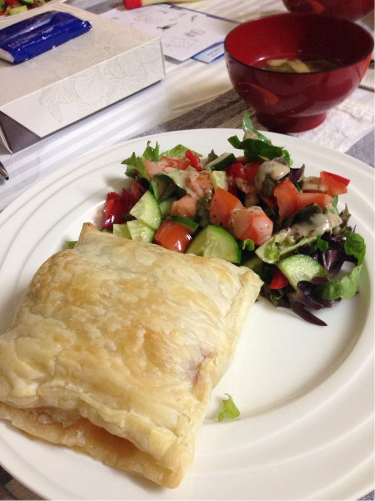 同じ日のディナー。サーモンとホワイトソースパイ包み、姉の手作り。