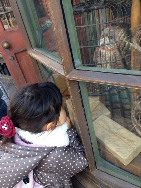 ふくろう屋さんに張り付くYちゃん。かわゆい。
