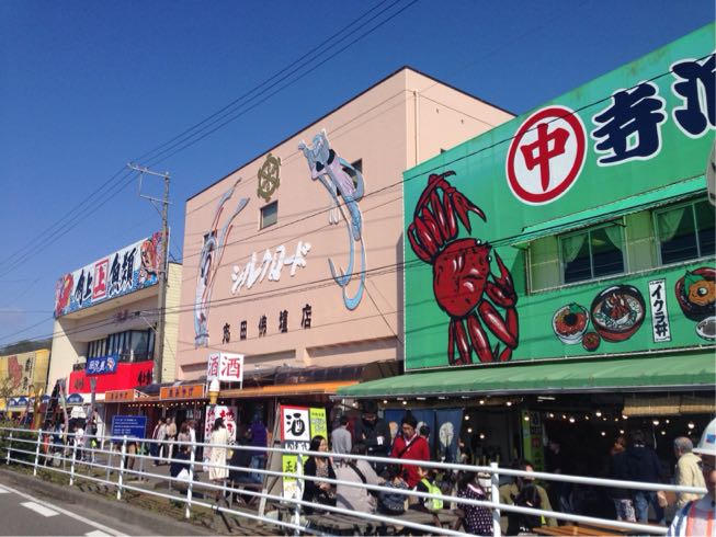 ここ、結構人気の観光スポットなんですね。魚市場が立ち並んで賑わっていました。二階で食事ができます。