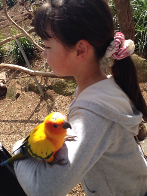 更に、鳥小屋に入って鳥たちとも触れ合えます。カラフルな鳥たちが続々頭や肩に乗ってきます。そして私は背中にフ○を頂きました