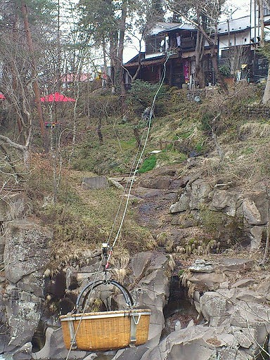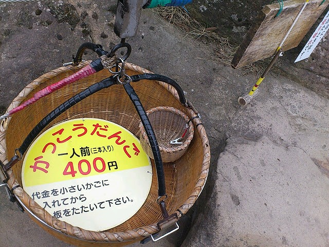 お店の人がかごを引き上げ、おだんごとお茶をかごに入れて下ろしてくれる。